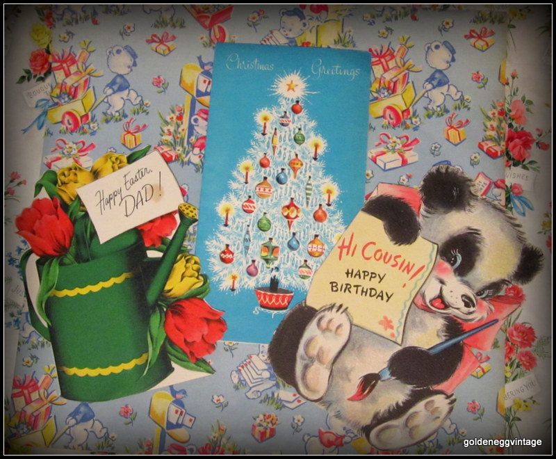 I added 3 cute vintage cards to my collection for only $1 each. I really want to get into fixing vintage images (digitally), and perhaps make things with them to sell. I need to think about it some more, but Meri has given me some good advice! Speaking of, Meri (of ImaginMeri's Creations) actually sent me the super cute wrapping paper that's in the background, along with lots of other little treasures, when she sent her amazing Friendship Tag! Thank you so much Meri! You are a sweetheart!